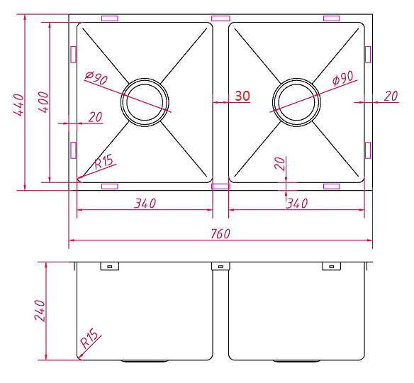 D88R-B Square Undermount sink / Drop In Sink Outer edges square Inner bowl round edges